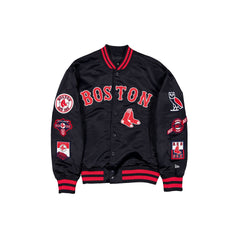The OVO x Boston Red Sox Jacket features an embroidered satin applique Red Sox wordmark and logo with a snap button closure at the front and an October's Very Own wordmark at the rear. Additional details include alternate team logo patches and a matching OVO logo patch at the sleeves with striped cuffs.