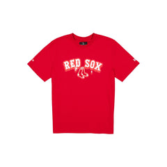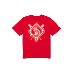 The OVO x Boston Red Sox T-Shirt features a spray paint effect Red Sox wordmark and logo screen-printed at the chest with a matching OVO baseball diamond graphic at the rear and an alternate team logo at the right sleeve.