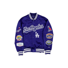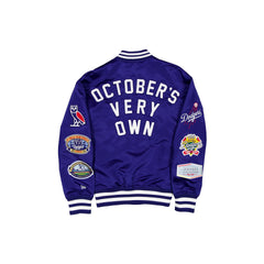 The OVO x Los Angeles Dodgers Jacket features an embroidered satin applique Dodgers wordmark and logo with a snap button closure at the front and an October's Very Own wordmark at the rear. Additional details include alternate team logo patches and a matching OVO logo patch at the sleeves with striped cuffs.