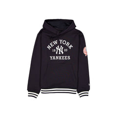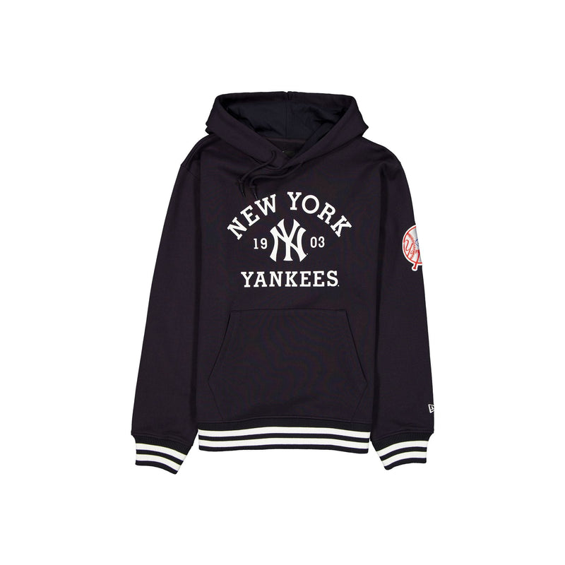The OVO x New York Yankees Hoodie features a screen-printed Yankees wordmark and logo at the chest with a matching OVO logo at the rear. Additional details include an embroidered alternate team logo at the left sleeve, adjustable drawstrings at the hood, and a striped cuffs.