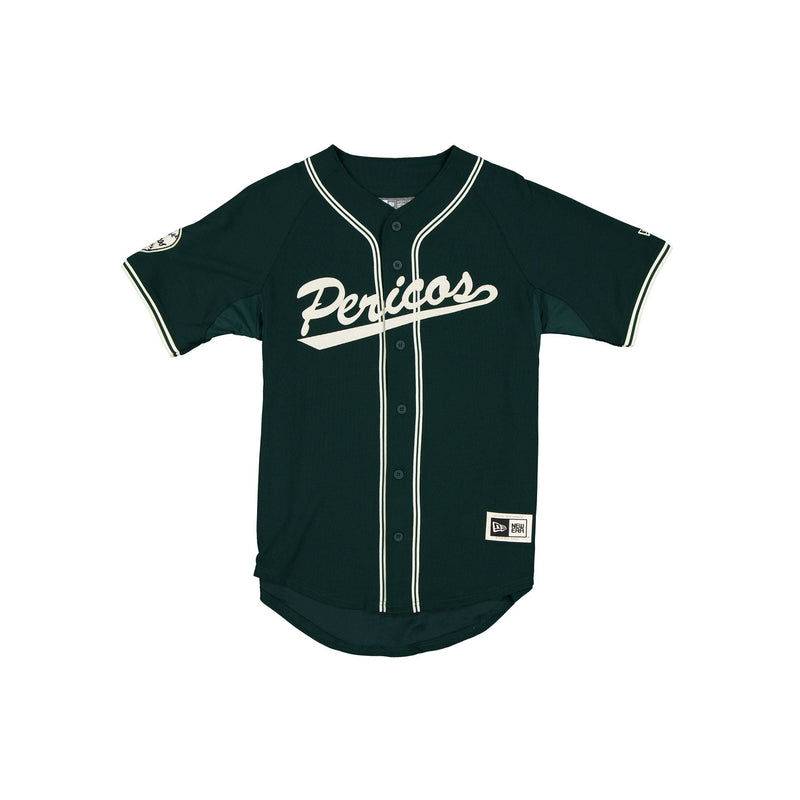 The Pericos de Puebla Retro Jersey features an embroidered Pericos applique logo at the chest with a New Era Official Merchandise patch at the front, a team patch at the right-wear sleeve, and a LMB logo at the rear.