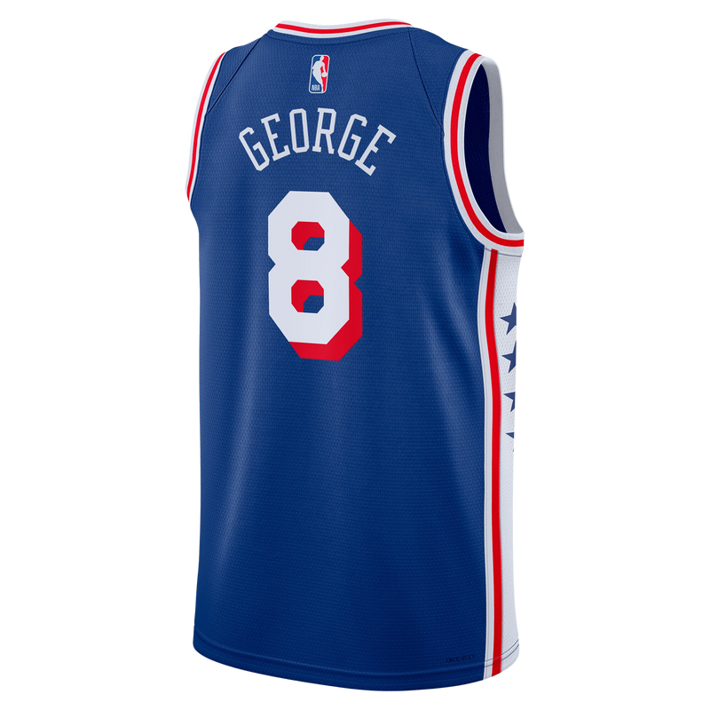 Paul George #8 Philadelphia 76ers Blue Icon Jersey. Claim the gear of a title contender with this bold Royal Blue design. White side stripe with three stars pays homage to '76, while the #8 represents George's commitment to greatness. Own the evolution.