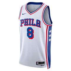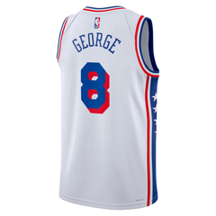 Paul George #8 Philadelphia 76ers White Association Jersey. Grab the official home threads in crisp white with tri-color accents and signature blue side stripe featuring three stars. A timeless design that honors history while celebrating the new era. Essential for any Sixers fan.