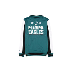 The Philadelphia Eagles Game Day Jacket features an embroidered Eagles logo at the left chest and graphic at the back. Additional details include pockets and a zipper closure.