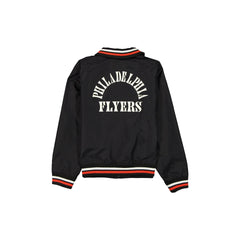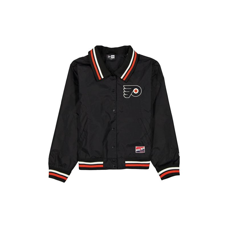 The Philadelphia Flyers Throwback Women's Jacket features an embroidered Flyers logo at the left chest with a screen-printed wordmark at the rear. Additional details include front pockets, a button closure, and a New Era jock tag at the left hip.