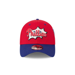 The Philadelphia Phillies Diamond Hero Edition 39THIRTY Stretch Fit features an embroidered Phillies onomatopoeia pop wordmark at the front panels with a ZOOM! wordmark at the left-wear side. Additional details include the MLB Batterman logo at the rear and a baseball comic undervisor.