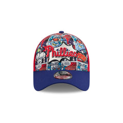 The Philadelphia Phillies Diamond Hero Edition 9FORTY A-Frame Snapback features an embroidered Phillies onomatopoeia pop wordmark at the front panels with baseball comic book prints at the front and back panel. Additional details include a ZOOM! wordmark at the left-wear side, the MLB Batterman logo above a snapback closure at the rear, and a black undervisor.