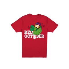The Philadelphia Phillies Red October T-Shirt features a screen-printed Phillie Phanatic mascot with a Red October wordmark at the front.