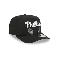 The Philadelphia Phillies Skeletal Script 9FIFTY A-Frame Snapback features a glow-in-the-dark embroidered Phillies wordmark and skeleton hands at the front with an MLB Batterman logo at the right of a snapback closure at the rear and a gray undervisor.