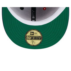 The Philadelphia Phillies Spring Satin 59FIFTY Fitted Cap features an embroidered Phillies wordmark at the front panels with a New Era pin at the top left panel and an MLB Batterman logo at the rear. Additional details include a satin fabrication throughout, a logo at the right-wear side, and a green undervisor.