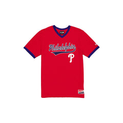 The Philadelphia Phillies Throwback Team T-Shirt features a screen-printed Phillies wordmark and embroidered team logo at the front with a New Era jock tag at the left hip. This t-shirt has a v-neckline.