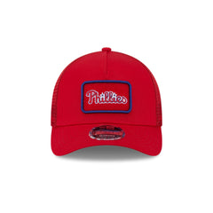 The Philadelphia Phillies Tonal Patch 9FORTY M-Crown A-Frame Trucker features an embroidered Phillies wordmark patch at the front panels with a team tag on a snapback closure at a mesh rear.