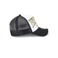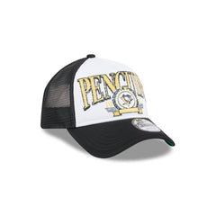 The Pittsburgh Penguins Distressed 9FORTY A-Frame Trucker features a distressed screen-printed Penguins wordmark and logo at the front panels with a team tag at a snapback closure at the rear and a green undervisor.