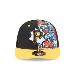 The Pittsburgh Pirates Diamond Hero Edition Low Profile 59FIFTY Fitted Cap features an embroidered Pirates onomatopoeia pop logo at the front panels with baseball comic book prints at the front and back panel. Additional details include the MLB Batterman logo at the rear and a gray undervisor. This cap comes with a pre-curved visor.