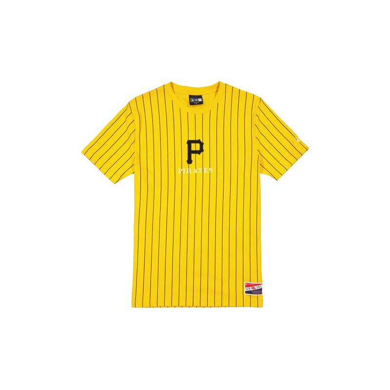 The Pittsburgh Pirates Throwback Pinstripe T-Shirt features an embroidered Pirates logo and wordmark at the front with a New Era jock tag at the left hip.