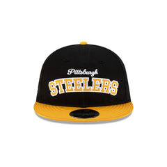 The Pittsburgh Steelers International Games Series Historic Retro Crown 9FIFTY Snapback features an embroidered Steelers wordmark at the front panels with a historic logo at the right wear side and an adjustable snapback closure at the rear.