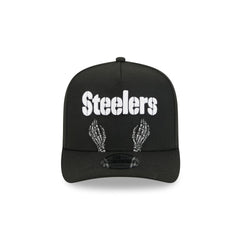 The Pittsburgh Steelers Skeletal Script 9FIFTY A-Frame Snapback features a glow-in-the-dark embroidered Steelers wordmark and skeleton hands at the front with an NFL Shield at the right of a snapback closure at the rear and a gray undervisor.