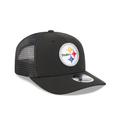 The Pittsburgh Steelers Team 9SEVENTY Trucker features an embroidered Steelers logo at the front panels with a matching NFL Shield logo above an adjustable snapback closure at a mesh rear and a gray undervisor.