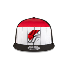 The Portland Trail Blazers 2025 Tip-Off Split Panel 9FIFTY Snapback features an embroidered Trail Blazers logo at the front panels against a pinstripe jersey fabrication with the NBA Logoman at the right-wear side. Additional details include an adjustable snapback closure at the rear and a gray undervisor.