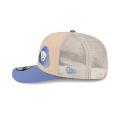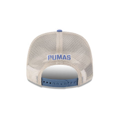 The Pumas Dual Logo 9SEVENTY Trucker features the Pumas primary and alternative logos embroidered at the front panels with a matching team wordmark above a snapback closure at the rear. Additional details include a blue visor and a gray undervisor.