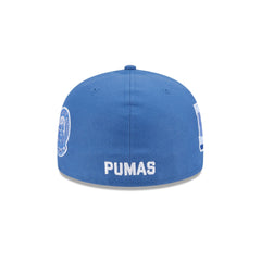 The Pumas Indigo 59FIFTY Fitted Cap features the Pumas primary logo embroidered at the front panels with alternate team logos throughout the crown, a team wordmark at the rear, and a gray undervisor.