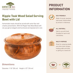 This handcrafted teak wood salad serving bowl with lid combines timeless craftsmanship and natural design. Made from solid teak, each piece features a ripple texture that highlights the wood’s organic grain and warm tones. Finished with a food-safe coating, it’s suitable for both hot and cold dishes. The matching lid makes it ideal for storing or serving salads, fruits, noodles, and other meals while maintaining freshness and style.
