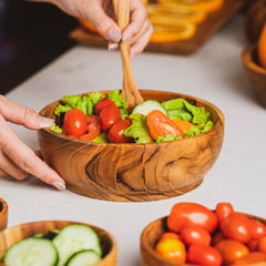 This handcrafted round footed teak wood bowl blends natural style with everyday practicality. Made from solid teak, each piece is unique with rich wood grain patterns and warm tones. With its food-safe finish and durable build, this versatile bowl is ideal for serving hot or cold dishes, making it a functional and elegant addition to your kitchen or dining table.