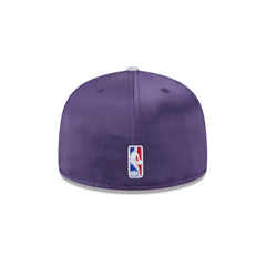 The Sacramento Kings Spring Satin 59FIFTY Fitted Cap features an embroidered Kings wordmark at the front panels with a New Era pin at the top left panel and an NBA Logoman at the rear. Additional details include a satin fabrication throughout, a logo at the right-wear side, and a green undervisor.