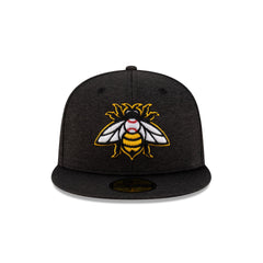The Salt Lake Bees Shadow Tech Black 59FIFTY Fitted Cap features an embroidered Bees logo at the front panels with a patch at the right-wear side and a gray undervisor.