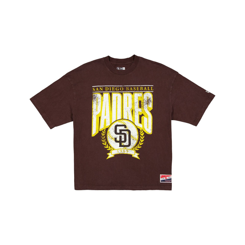 The San Diego Padres Throwback Boxy T-Shirt features a screen-printed Padres graphic at the front and a New Era jock tag at the left hip.