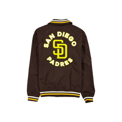 The San Diego Padres Throwback Jacket features an embroidered Padres logo at the left chest with a logo and wordmark at the rear. Additional details include pockets, a button closure, and a New Era jock tag at the left hip.