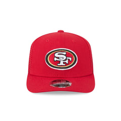 The San Francisco 49ers Team 9SEVENTY Trucker features an embroidered 49ers logo at the front panels with a matching NFL Shield logo above an adjustable snapback closure at a mesh rear and a gray undervisor.