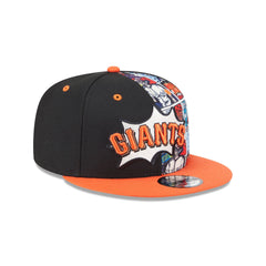 The San Francisco Giants Diamond Hero Edition 9FIFTY Snapback features an embroidered Giants onomatopoeia pop wordmark at the front panels with baseball comic book prints at the front and back panel. Additional details include a ZOOM! wordmark at the left-wear side, the MLB Batterman logo above a snapback closure at the rear, and a gray undervisor.