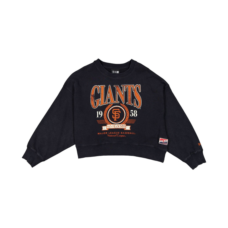The San Francisco Giants Throwback Women's Crewneck features a screen-printed Giants graphic at the front and a New Era jock tag at the left hip.