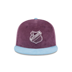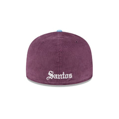 The Santos Laguna Plum Corduroy 59FIFTY Fitted Cap features an embroidered Santos logo at the front panels with a matching team wordmark at the rear, a blue corduroy visor, and a gray undervisor.