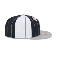 The Seattle Mariners Pinstripe League Pin 59FIFTY Fitted Cap features an embroidered Mariners logo at the front panels with a League pin at the front right panel. Additional details include pinstripes, a matching MLB Batterman logo at the rear, and a gray undervisor.