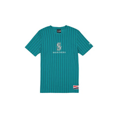 The Seattle Mariners Throwback Pinstripe T-Shirt features an embroidered Mariners logo and wordmark at the front with a New Era jock tag at the left hip.