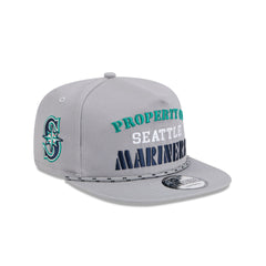 The Seattle Mariners Vintage Gray Golfer features an embroidered 'PROPERTY OF' Mariners wordmark at the front panels with a team logo at the right-wear side and a rope at the visor. Additional details include a snapback closure at the rear and a green undervisor.