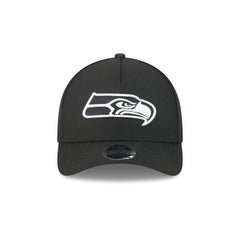The Seattle Seahawks Black & White 9FORTY M-Crown A-Frame Snapback features an embroidered Seahawks logo at the front panels with an adjustable snapback closure at the rear and a gray undervisor.