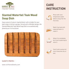 This handcrafted teak wood soap dish features a slanted waterfall design with built-in drainage grooves that keep soap dry and extend its use. Carved from solid Javanese teak wood, it combines natural beauty with practical function, making it a timeless addition to your bathroom, kitchen, or wash area.