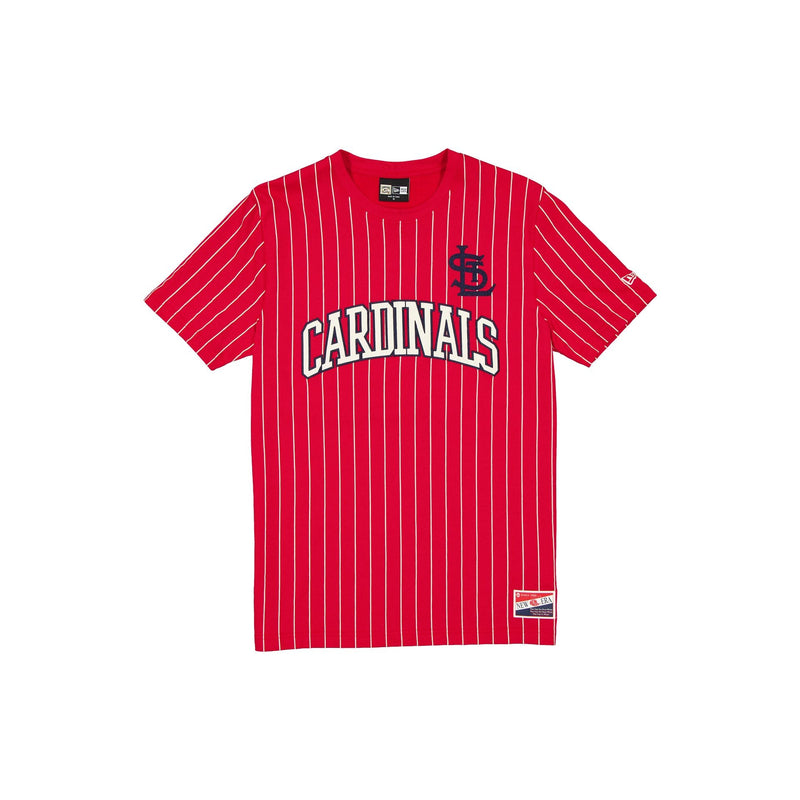 The St. Louis Cardinals Throwback Pinstripe Wordmark T-Shirt features a twill applique Cardinals wordmark and Cooperstown logo at the front with a New Era jock tag at the left hip.