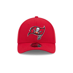 The Tampa Bay Buccaneers Team 9FORTY M-Crown Snapback features an embroidered Buccaneers logo at the front panels with a matching NFL Shield logo above an adjustable snapback closure at the rear and a gray undervisor.