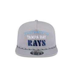 The Tampa Bay Rays Vintage Gray Golfer features an embroidered 'PROPERTY OF' Rays wordmark at the front panels with a team logo at the right-wear side and a rope at the visor. Additional details include a snapback closure at the rear and a green undervisor.
