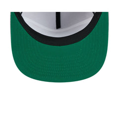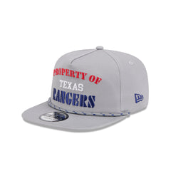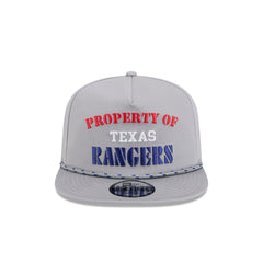 The Texas Rangers Vintage Gray Golfer features an embroidered 'PROPERTY OF' Rangers wordmark at the front panels with a team logo at the right-wear side and a rope at the visor. Additional details include a snapback closure at the rear and a green undervisor.