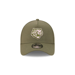 The Tigres de Quintana Roo Olive 9FORTY A-Frame Snapback features an embroidered Tigres logo at the front with a snapback closure at the rear and a gray undervisor.