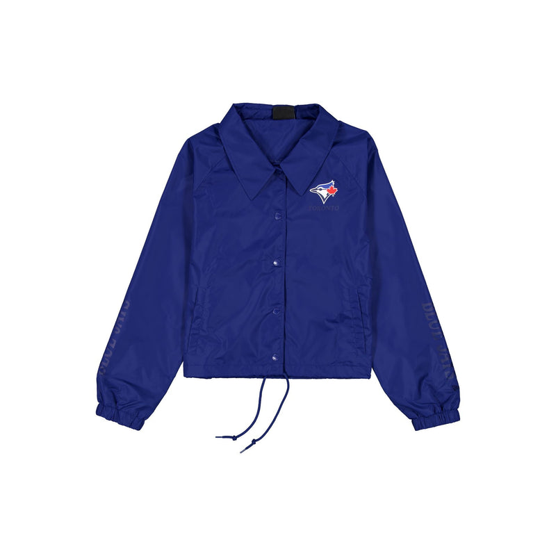 The Toronto Blue Jays Game Day Women's Jacket features a screen-printed Blue Jays logo at the left chest with a wordmark at each sleeve. Additional details include a button closure, pockets, and adjustable drawstrings at the waist.