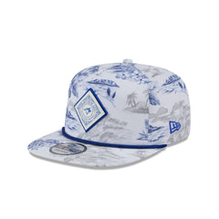 The Toronto Blue Jays Printed Golfer features an allover team color print fabrication with a faux leather and felt appliqué Blue Jays logo at the front panels with a snapback closure at the rear.
