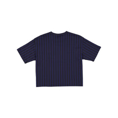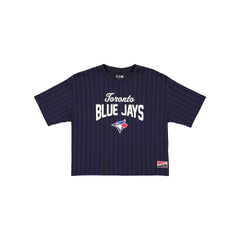 The Toronto Blue Jays Throwback Women's Pinstripe T-Shirt features a screen-printed Blue Jays wordmark and logo at the front with a New Era jock tag at the left hip.