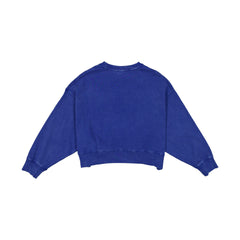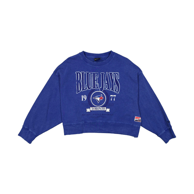 The Toronto Blue Jays Throwback Women's Crewneck features a screen-printed Blue Jays graphic at the front and a New Era jock tag at the left hip.