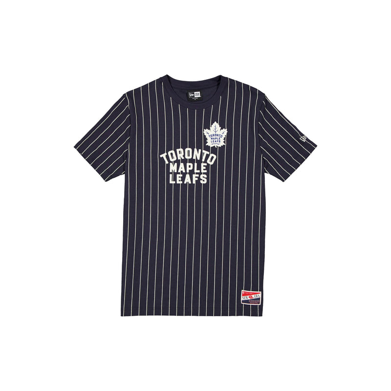 The Toronto Maple Leafs Throwback Pinstripe Wordmark T-Shirt features a twill applique Maple Leafs wordmark and logo at the front with a New Era jock tag at the left hip.